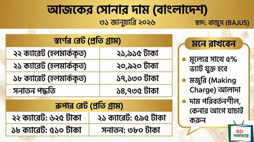 তথ্যসূত্র: বাংলাদেশ জুয়েলার্স এসোসিয়েশন (বাজুস), তারিখ: ৩১ জানুয়ারি ২০২৬ ।