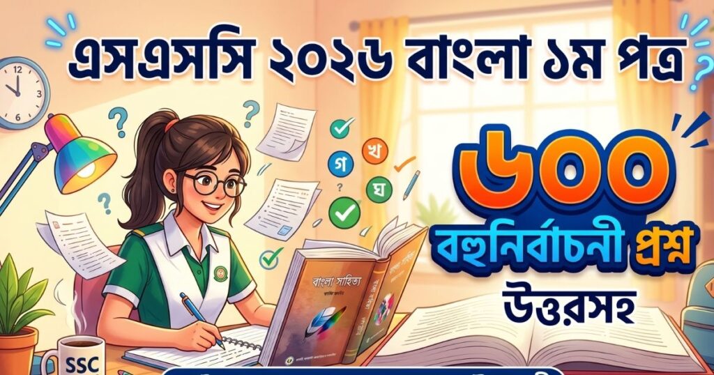 এসএসসি ২০২৬ সালের পরীক্ষার্থীদের জন্য বাংলা ১ম পত্রের ১০০% কমন উপযোগী ৬০০টি বহুনির্বাচনী প্রশ্ন (MCQ) ও নির্ভুল উত্তর নিয়ে আমাদের আজকের এই বিশেষ আয়োজন। পরীক্ষায় ভালো ফলাফল অর্জনের জন্য বোর্ড বইয়ের প্রতিটি অধ্যায় থেকে বাছাই করা এই প্রশ্নগুলো অনুশীলন করা অত্যন্ত জরুরি।