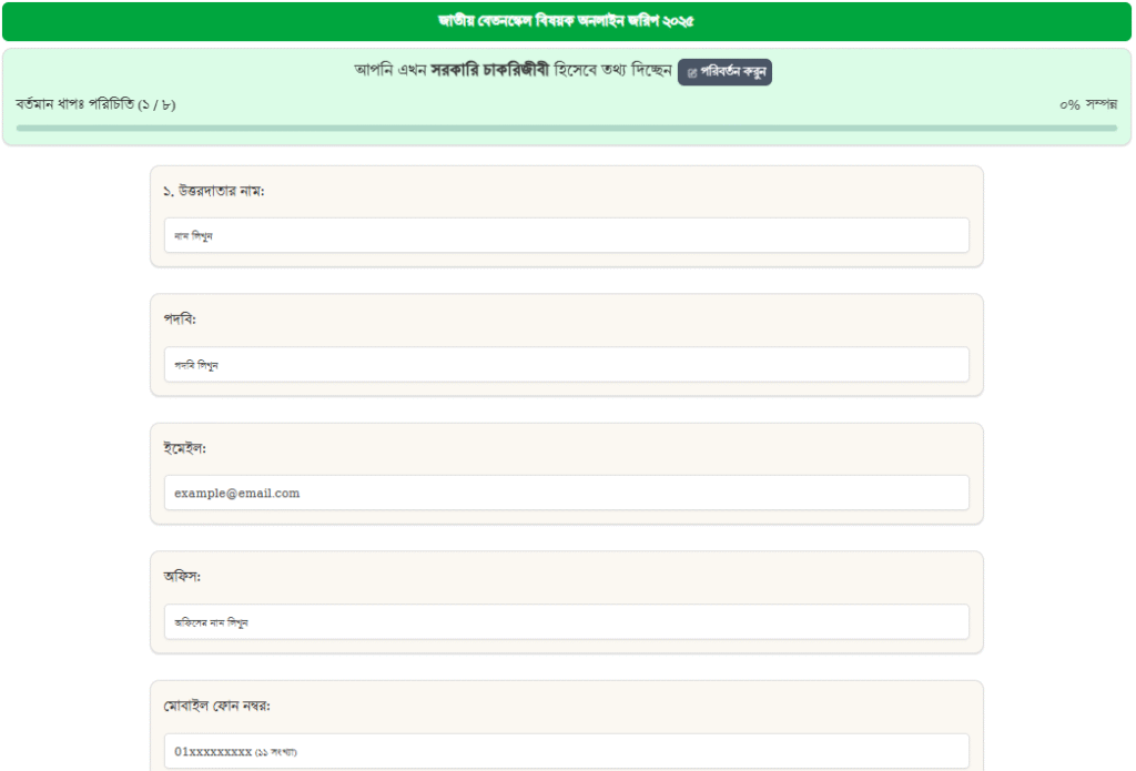 প্রথমে আপনাকে যেতে হবে কমিশনের অফিশিয়াল ওয়েবসাইটে: https://paycommission2025.gov.bd। সেখানে পাবেন বিভিন্ন ক্যাটাগরির জন্য আলাদা ফরম।