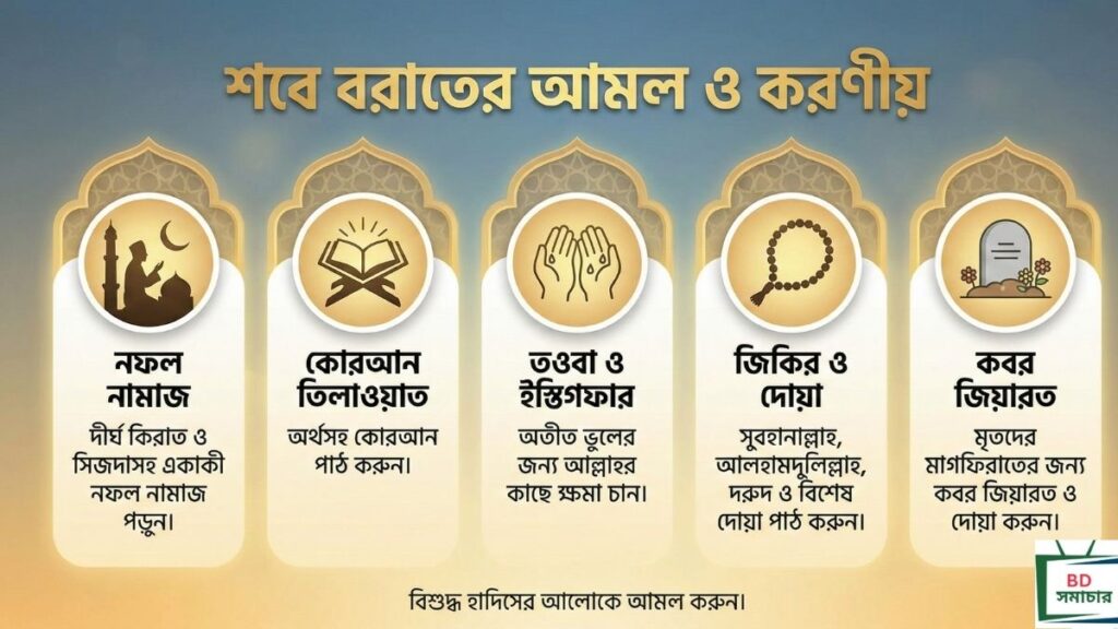 শবে বরাতকে কেন্দ্র করে কোনো ধরাবাঁধা নির্দিষ্ট নিয়ম নেই, তবে নফল ইবাদতের মাধ্যমে এই রাত কাটানো অত্যন্ত কল্যাণকর। বাংলাদেশিদের জন্য কার্যকর কিছু আমল নিচে দেওয়া হলো: