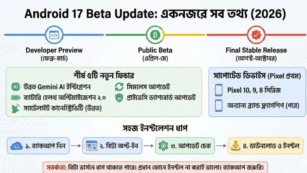 Android 17-এর প্রথম ‘Developer Preview’ এই মাসেই (ফেব্রুয়ারি ২০২৬) রিলিজ হওয়ার কথা রয়েছে। তবে সাধারণ ব্যবহারকারীদের জন্য Public Beta Update