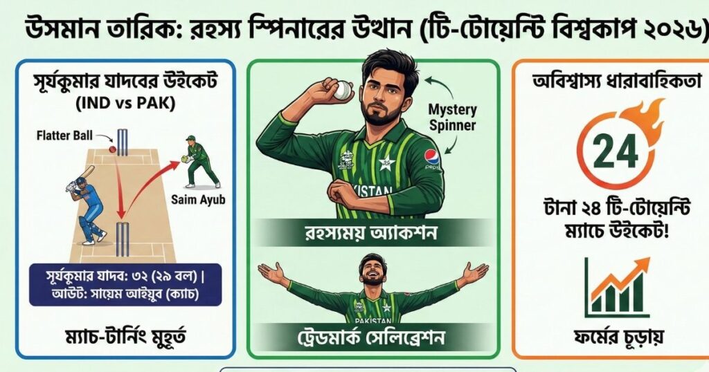 টি-টোয়েন্টি বিশ্বকাপ ২০২৬-এর হাই-ভোল্টেজ ভারত বনাম পাকিস্তান ম্যাচে ক্রিকেট বিশ্ব এক নতুন ‘মিস্ট্রি স্পিনার’-এর উত্থান দেখল। তিনি উসমান তারিক। বিশেষ