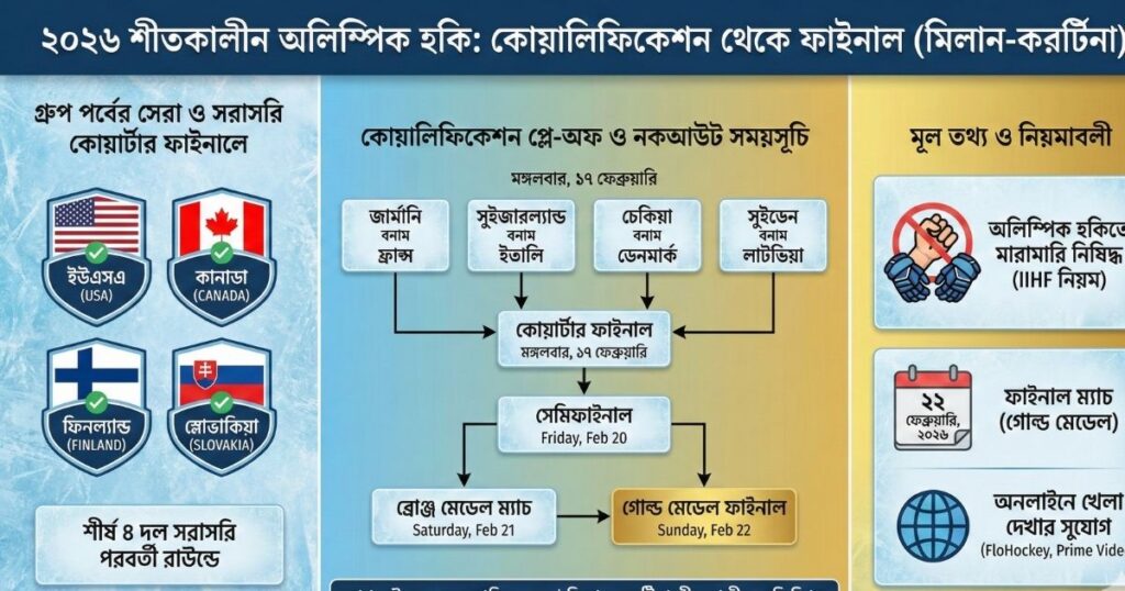 মিলান-করটিনা ২০২৬ শীতকালীন অলিম্পিকের পুরুষদের আইস হকি গ্রুপ পর্ব শেষ হয়েছে। টিম ইউএসএ (USA), কানাডা, স্লোভাকিয়া এবং ফিনল্যান্ড দুর্দান্ত পারফরম্যান্স