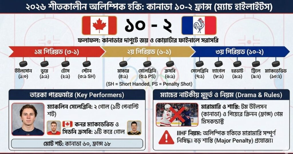 ২০২৬ শীতকালীন অলিম্পিকের গ্রুপ পর্বের শেষ ম্যাচে টিম কানাডা (Team Canada) ফ্রান্সকে ১০-২ গোলের বিশাল ব্যবধানে পরাজিত করেছে। এই দাপুটে