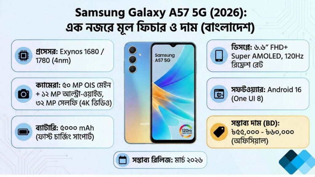 Samsung Galaxy A57 5G হলো স্যামসাংয়ের ২০২৬ সালের ফ্ল্যাগশিপ-লেভেল মিড-রেঞ্জ স্মার্টফোন। এতে থাকছে উন্নত Exynos 1680/1780 প্রসেসর (অঞ্চলভেদে), ৫০ মেগাপিক্সেল OIS ক্যামেরা, এবং One UI 8 (Android 16)। বাংলাদেশে Samsung Galaxy A57 5G-এর সম্ভাব্য দাম ৫৫,০০০ থেকে ৬০,০০০ টাকার মধ্যে (অফিসিয়াল) হতে পারে। এটি ২০২৬ সালের মার্চ মাসে গ্লোবাল এবং লোকাল মার্কেটে লঞ্চ হওয়ার প্রবল সম্ভাবনা রয়েছে।