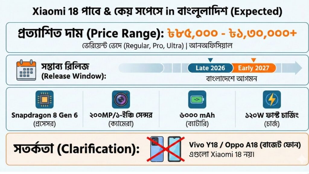 ২০২৬ সালের ফেব্রুয়ারি পর্যন্ত, Xiaomi 18 এখনও অফিসিয়ালি বাংলাদেশে রিলিজ হয়নি। এটি চীনে ২০২৬ সালের সেপ্টেম্বর নাগাদ লঞ্চ হতে পারে এবং বাংলাদেশে ২০২৬ সালের শেষ দিকে বা ২০২৭ এর শুরুতে আসার সম্ভাবনা রয়েছে। এর সম্ভাব্য দাম ৯০,০০০ টাকা থেকে ১,২০,০০০ টাকার মধ্যে হতে পারে (ভেরিয়েন্ট ভেদে)। তবে, আপনি যদি এখনই ১৮ সিরিজের ফোন খুঁজছেন, হতে পারে আপনি Vivo Y18 বা Oppo A18 এর সাথে গুলিয়ে ফেলছেন, যা বর্তমানে বাজারে বেশ জনপ্রিয় বাজেট ফোন।